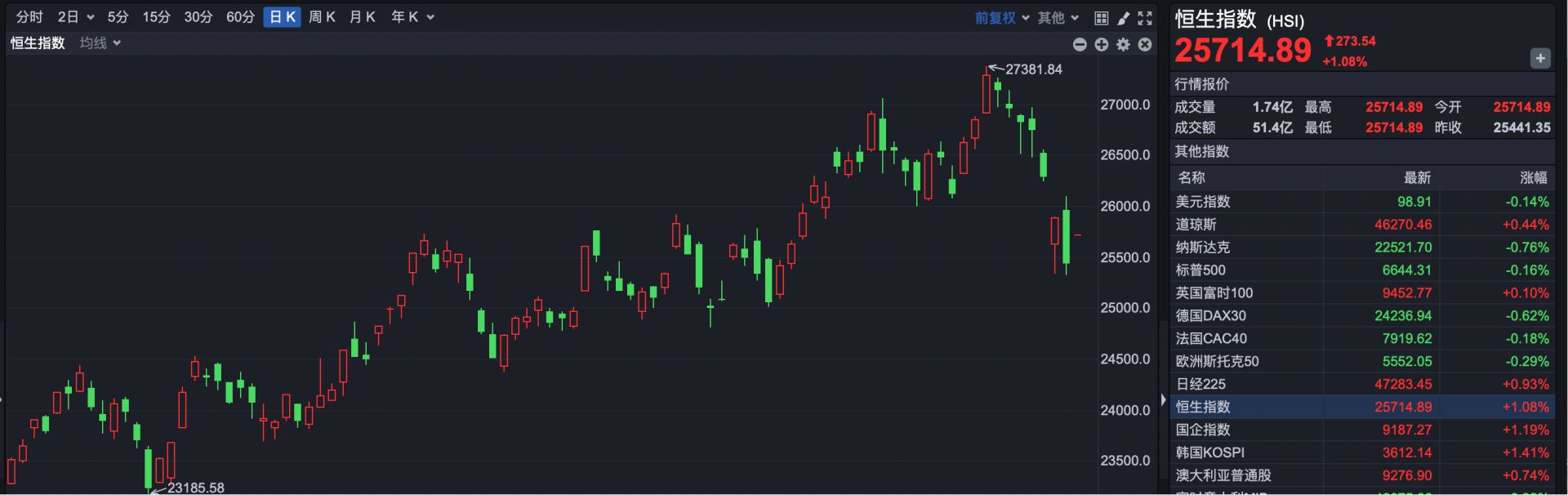 恒生指数开盘涨273.54点,报25714.89点,涨幅1.08%。