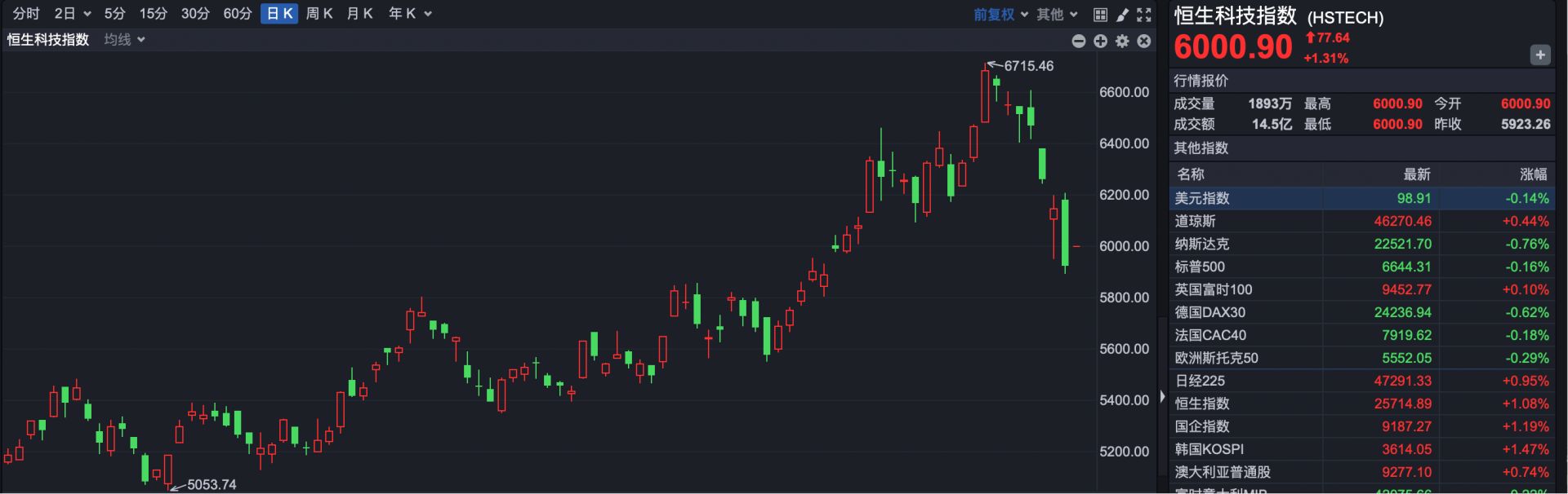 恒生科技指数上涨77.6点,报6000点,涨幅1.31%。